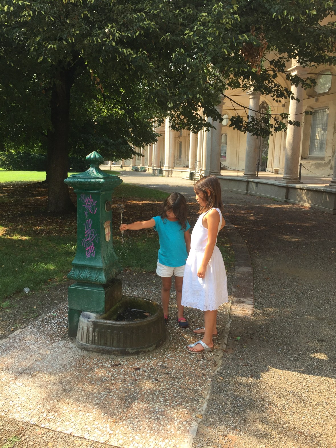 The sun came out after a little bit so the girls decided to cool off with some water from the many fountains all over the city.